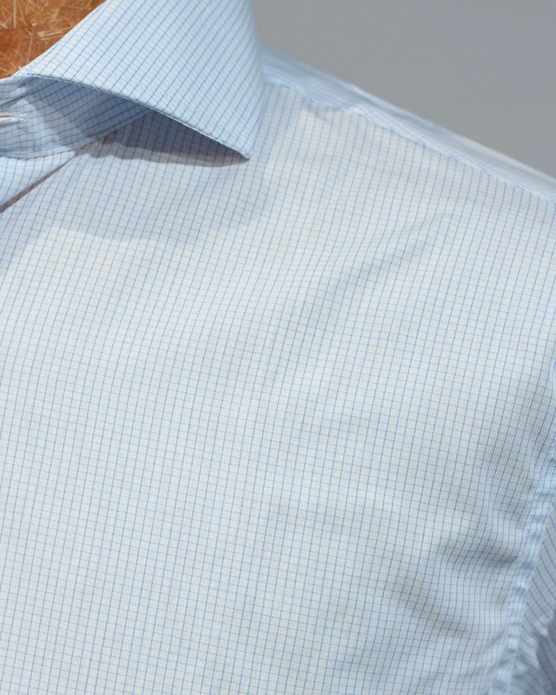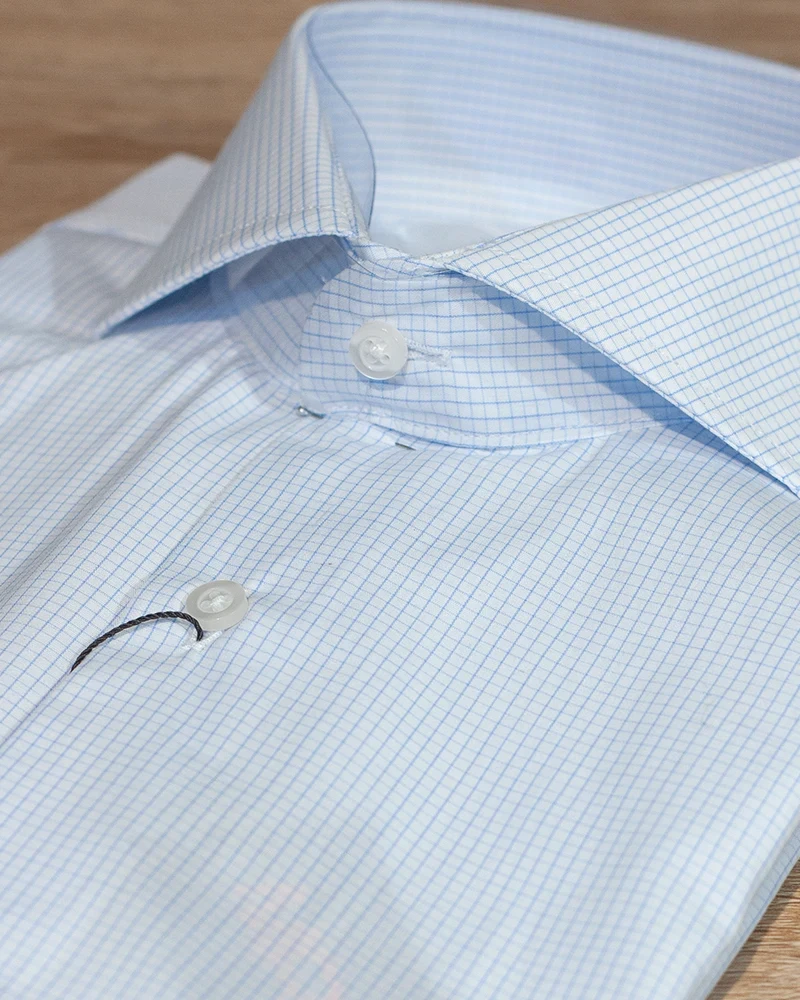 Camisa vestir a cuadros con patron semi-entallado, cuello cutaway y puño mixto.