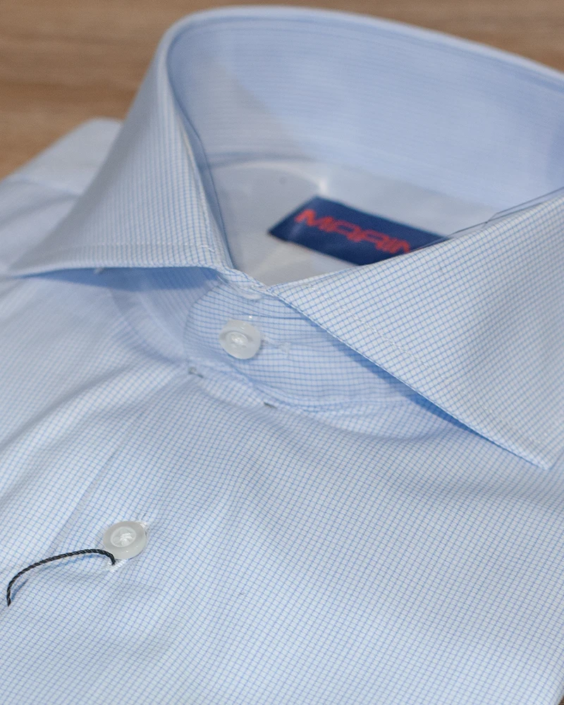 Camisa vestir a cuadros con patron semi-entallado, cuello cutaway y puño mixto.