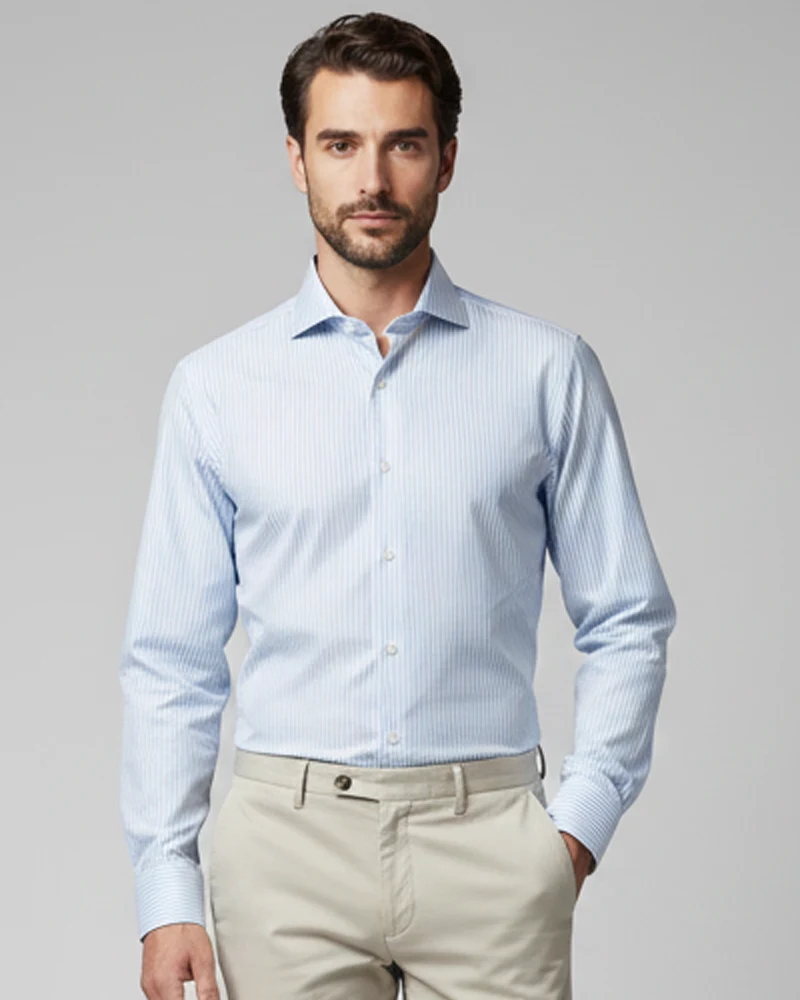 Camisa vestir a rayas con patron semi-entallado, cuello cutaway y puño mixto. Confeccion y tejido nacional