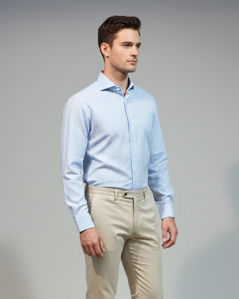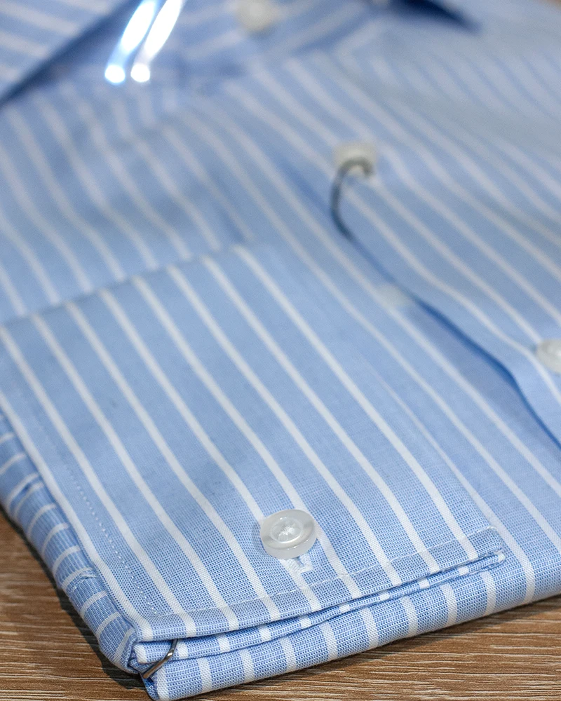 Camisa vestir a cuadros con patron semi-entallado, cuello cutaway y puño mixto.