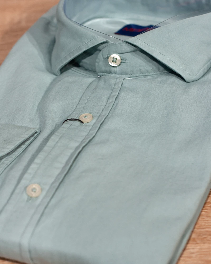 Camisa de estilo casual confeccionada en algodón 100%. Cuenta con cuello italiano con varillas extraibles, manga larga y puños simples. Patrón semientallado y tejido lavado.