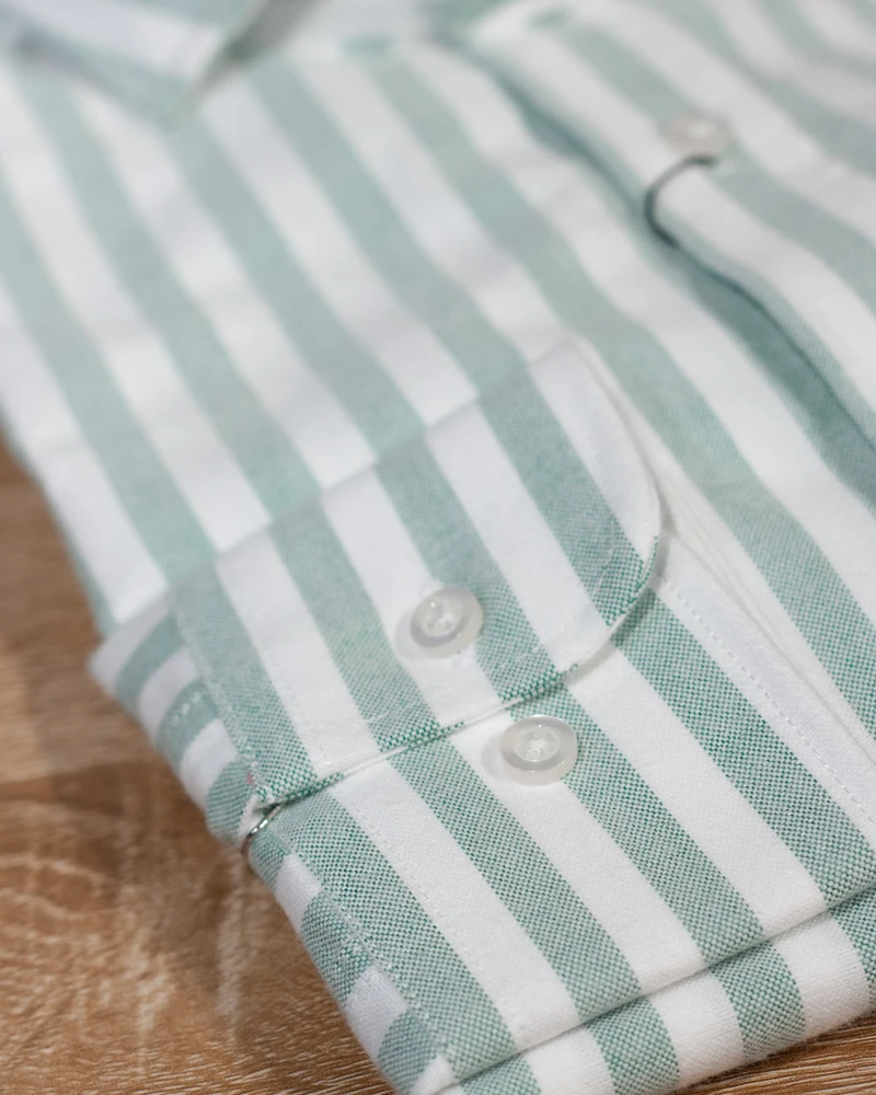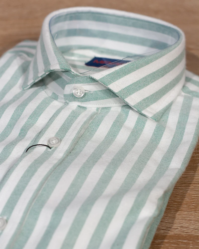 Camisa de corte regular fit confeccionada en algodón 100%. Diseño de tejido a rayas, cuello CUTAWAY y manga larga con puños simples.